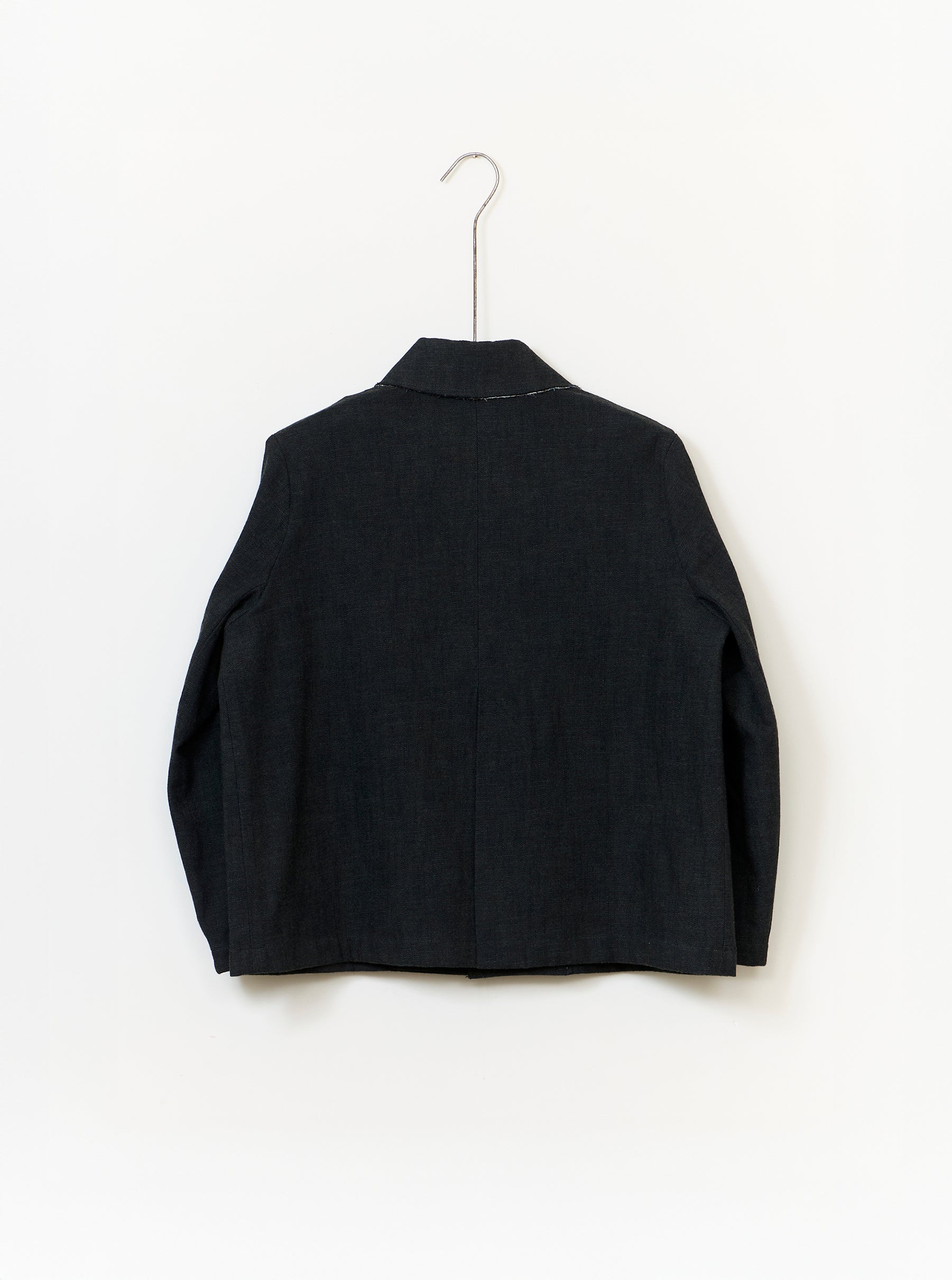 Unisex jacket featuring a sculptural front pockets, drawn on collar, deep cuffs and 4 button front opening.