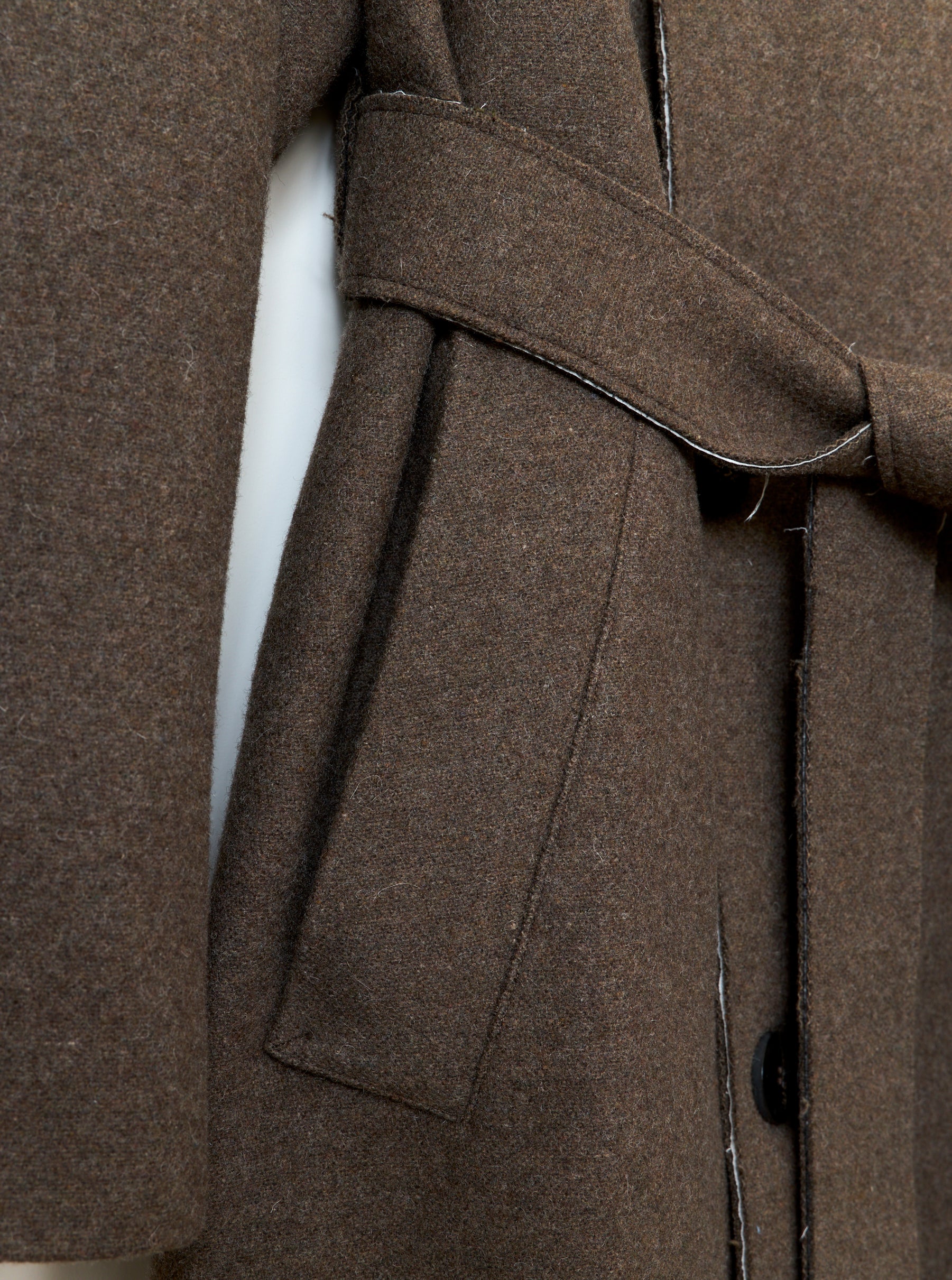 Generous raw edge collar and belt and belt loops mounted on top of a washed bone coloured Italian paper cotton. Top collar button to enclose you against the harsh winters weather.