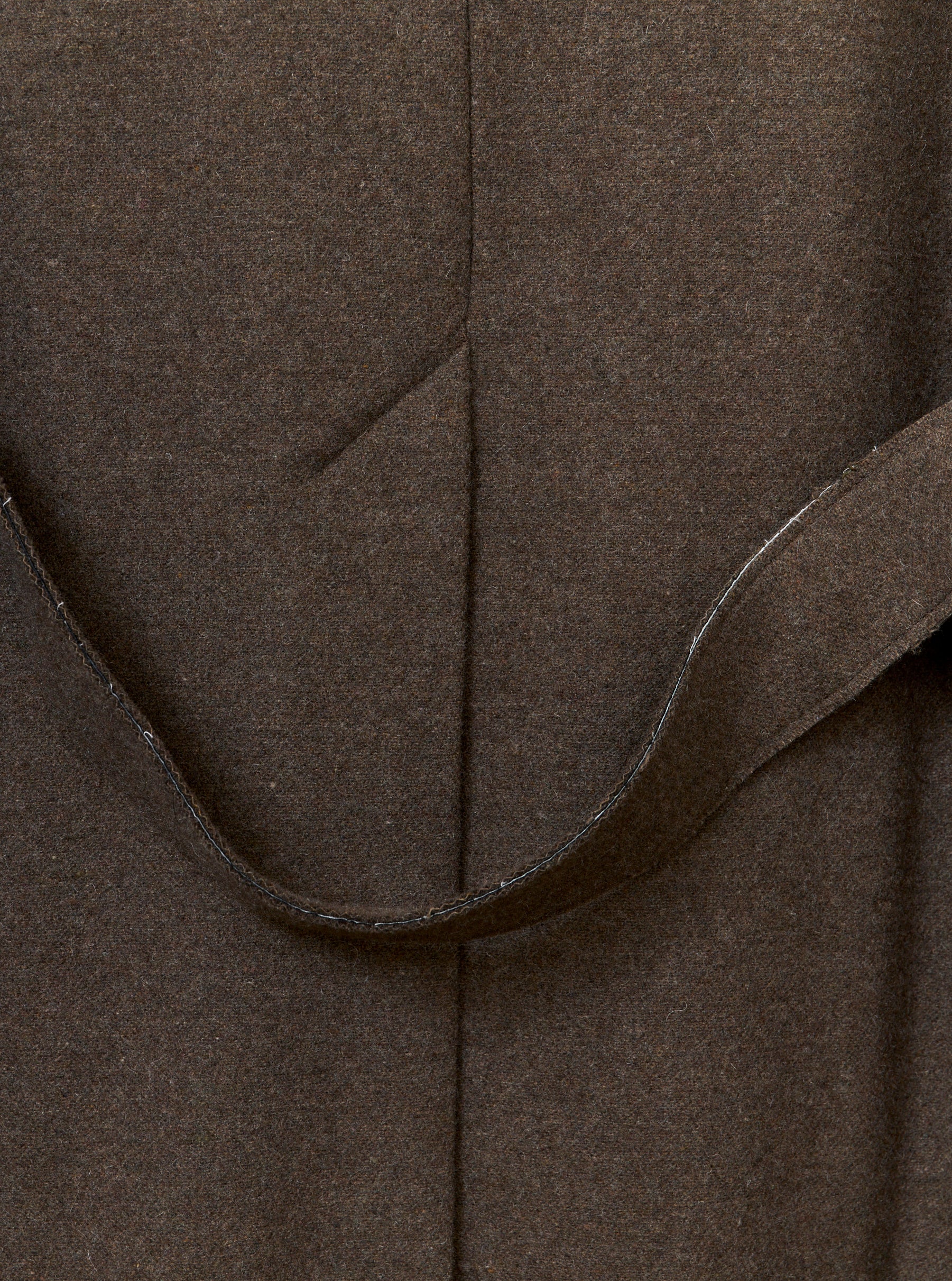 This coat is a cornerstone of the collection inspired by German Artist Joseph Beuys, drawing on his love of clothing and its role in the creative process, silhouettes explore the balance between form and function, celebrating utility and craftsmanship simultaneously. He was often in a large overcoat.