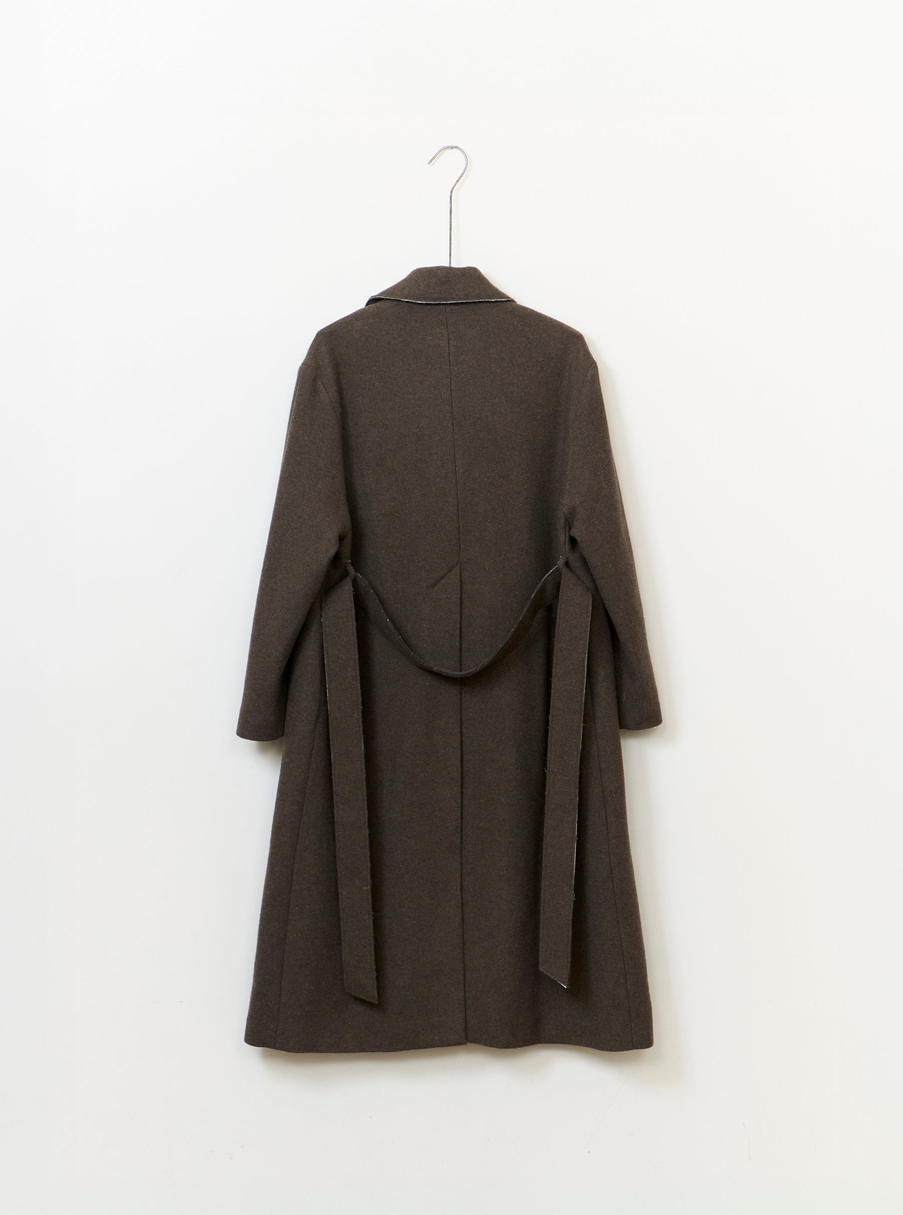 Long coat with double breast button opening, 2 front welt pockets and waist tie belt. Double set of belt loops at the sides allow the belt to be tied at the waist or lower for a relaxed feel.