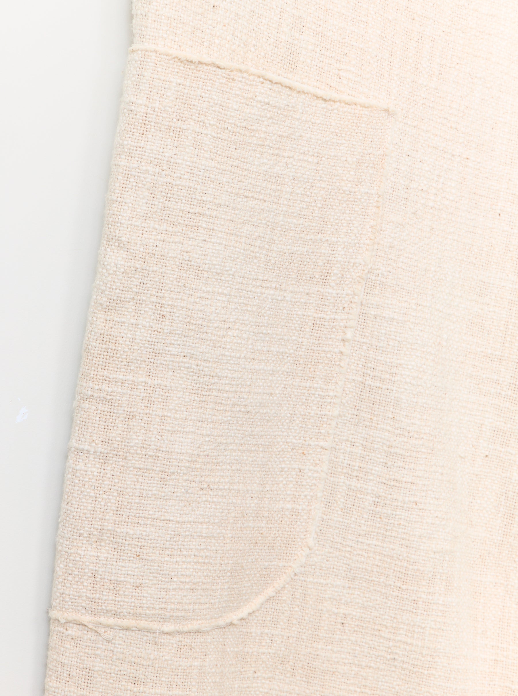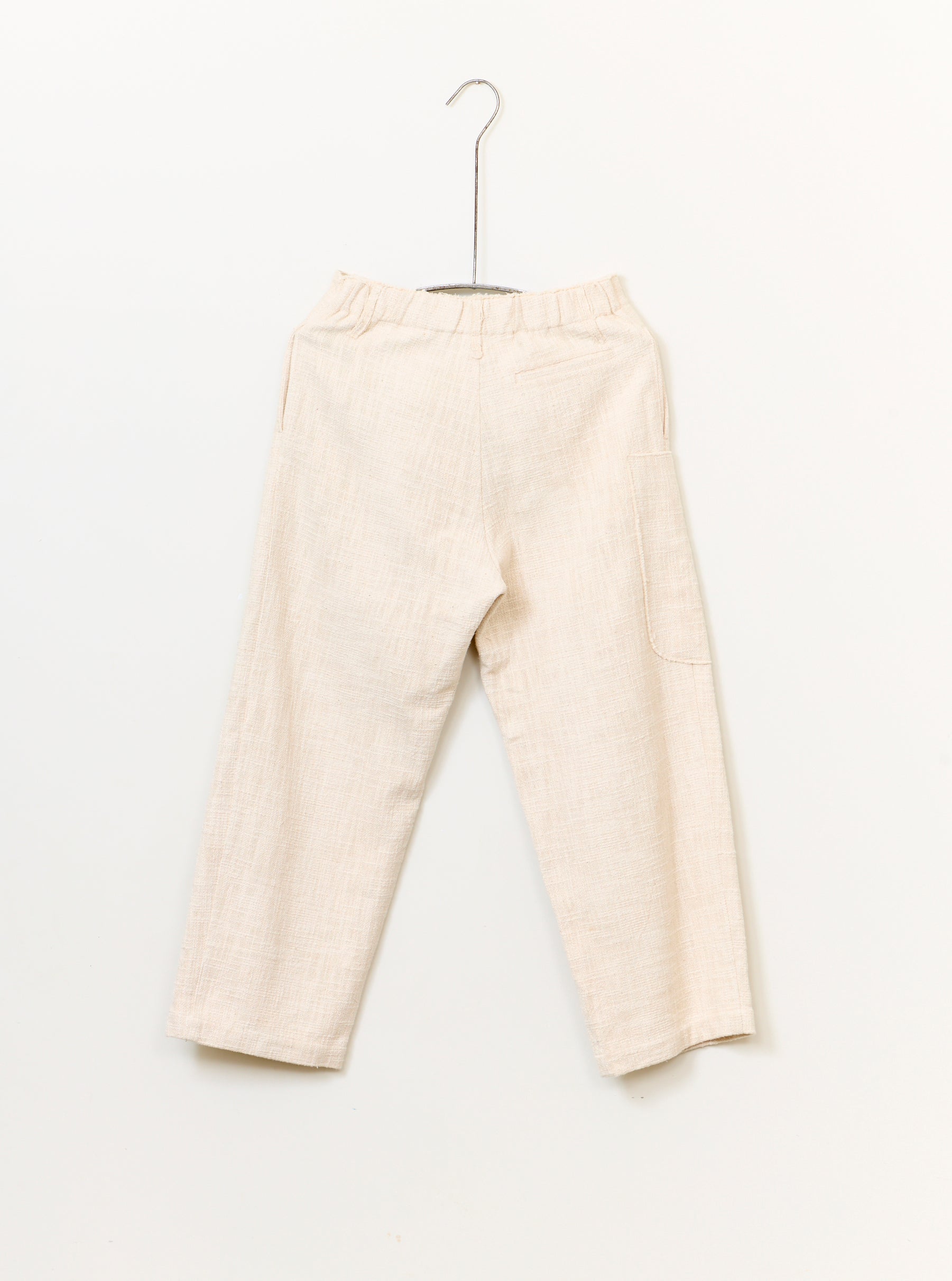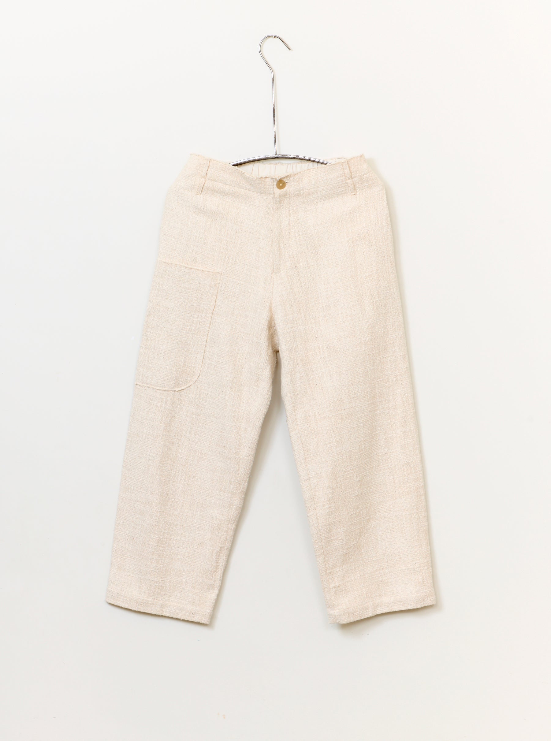 Unisex trouser made from Alabaster woven Yak wool & nettle. The Wilhelm is a relaxed style featuring two side pockets, an elasticated back waistband and side patch pocket mounted on top of a washed bone coloured Italian paper cotton.
