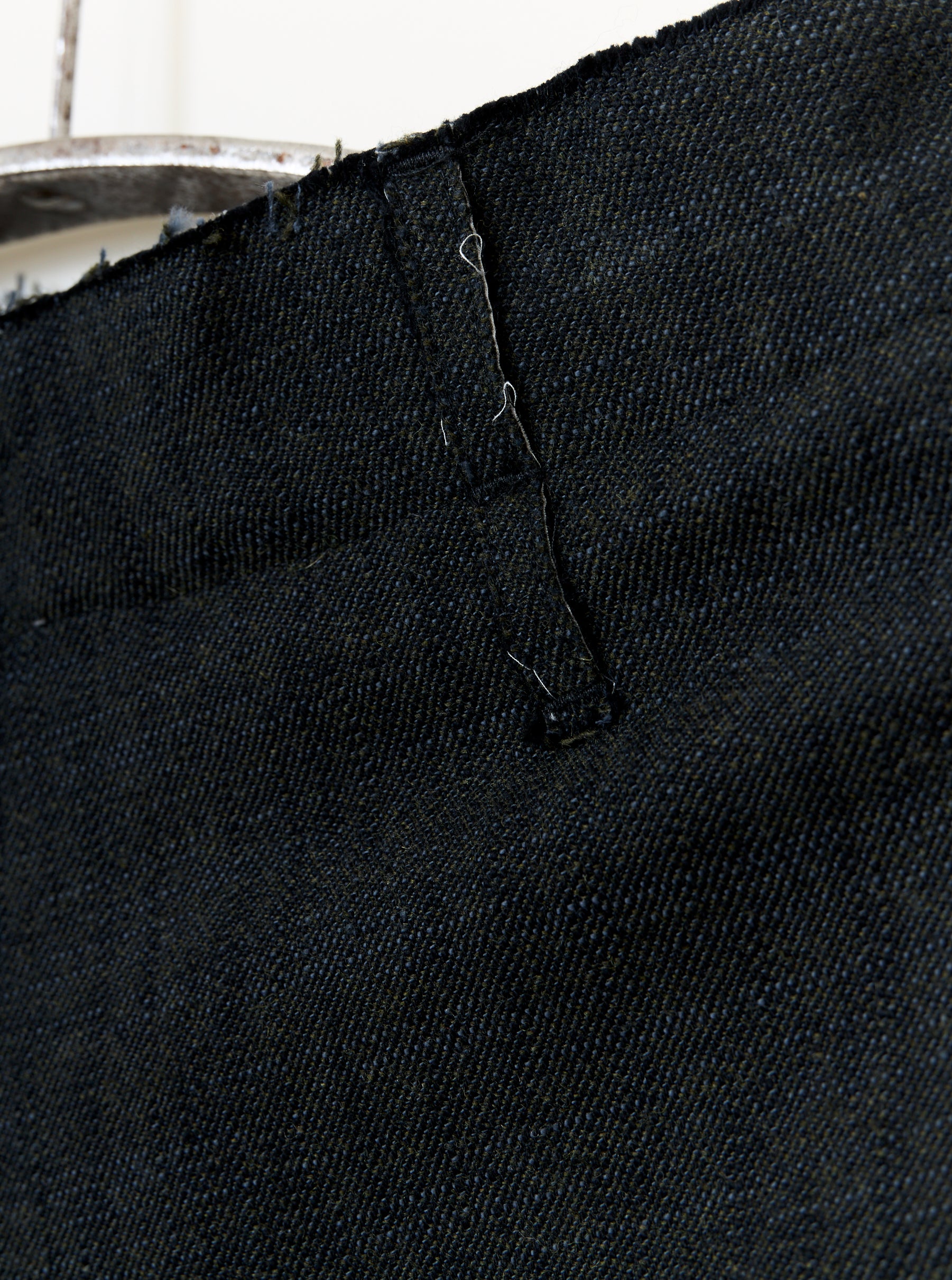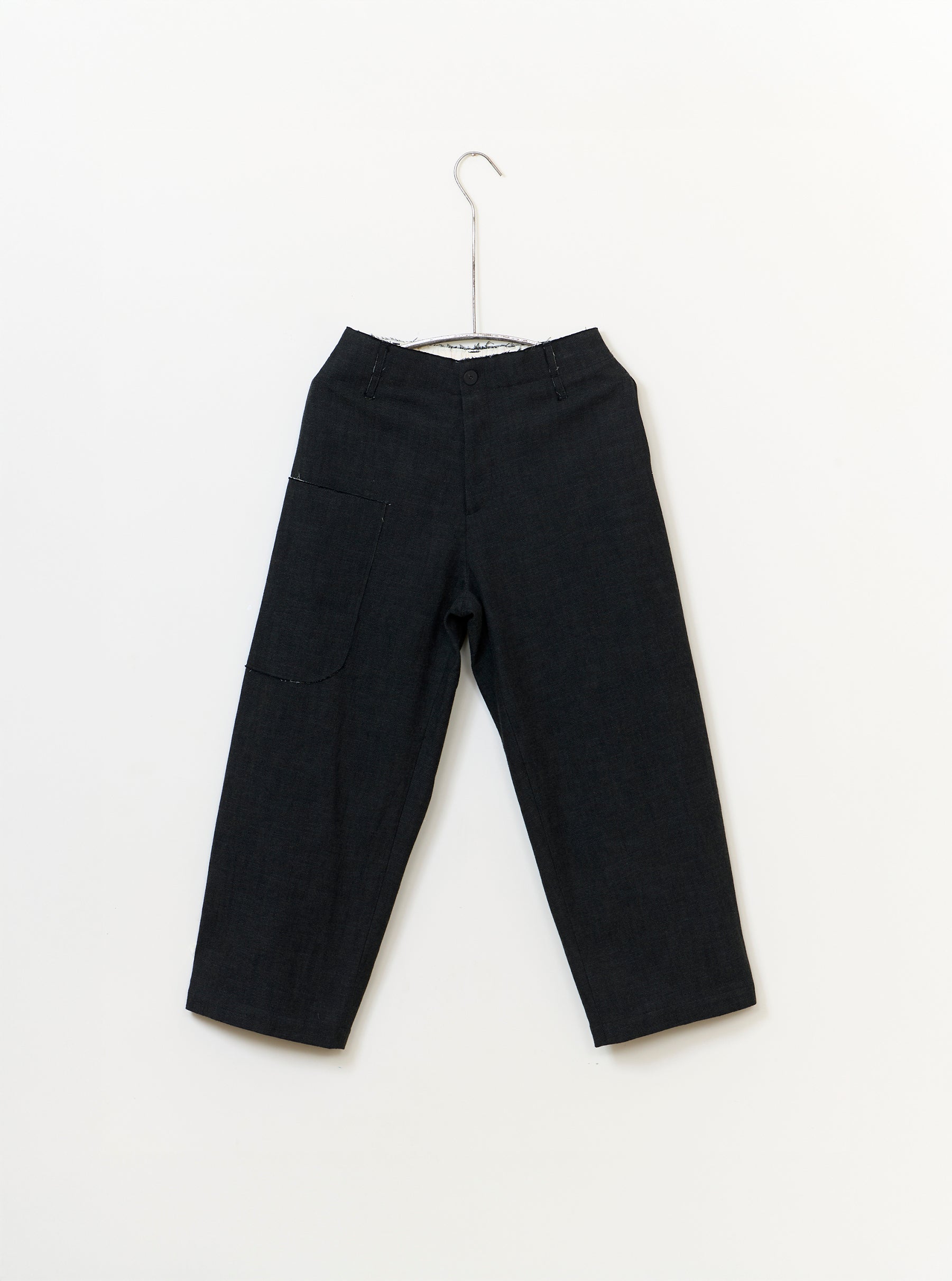 Unisex trouser made from Alga Green woven wool and cotton. The Wilhelm is a relaxed style featuring two side pockets, an elasticated back waistband and side patch pocket mounted on top of a washed bone coloured Italian paper cotton.